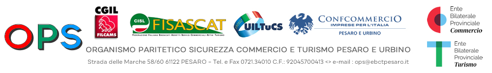 Nella Provincia di Pesaro-Urbino, presso la Sede dell'Ente Bilaterale, è operativo dal 24/05/2011 l’Organismo Paritetico Sicurezza Commercio e Turismo (O.P.S.) costituito tra l’Associazione datoriale Confcommercio di Pesaro-Urbino e le Organizzazioni Sindacali territoriali Filcams, Cgil, Fisascat, Cisl Uiltucs, Uil.
